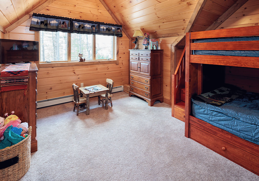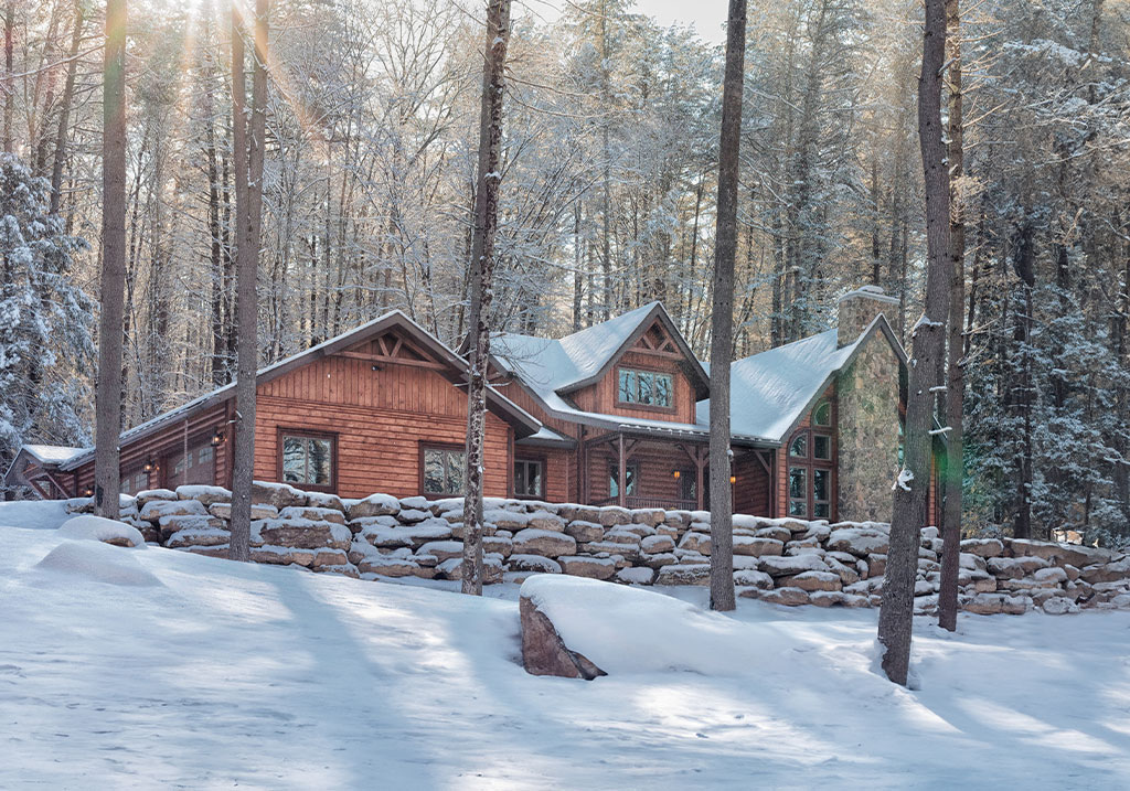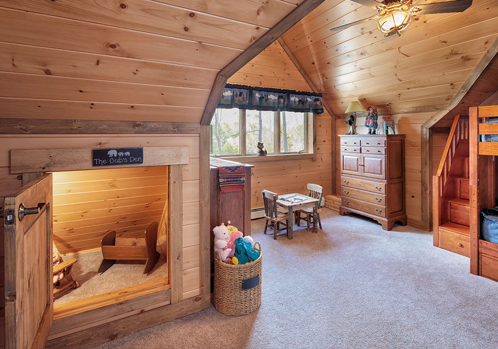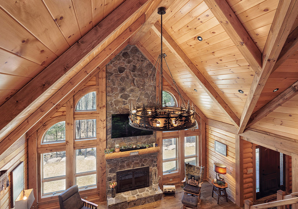 Set atop of a hill surrounded by tall pines, Black Bear Lodge overlooks a beaver pond and provides breathtaking views of the foliage and the many types of wildlife that live around them. And yes, this includes bears,hence the name! The property has a rich history, as it was once the home of a sawmill over 100 years ago. Water from the top of the mountain was used to run the mill which sent sawdust to the bottom of the lake. When the owners purchased this property, they had plans to repurpose the stone walls that were once a part of the mill. Every stone used to surround the floor-to-ceiling fireplace were sourced from the property by the owner and his grandson. And in the center of the fireplace is a stone that is the shape of a heart.