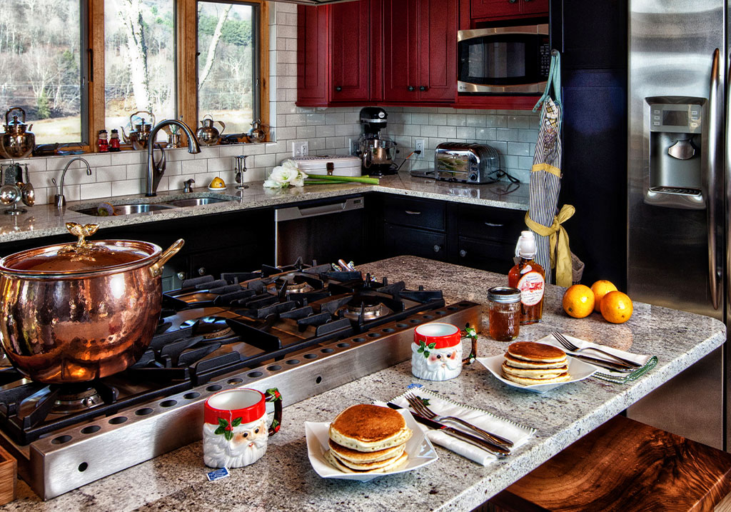 Built on the site of the original farmhouse, “Laughing Place” is both a retreat and a reflection. Large prow windows face out over the valley, offering panoramic views of rolling hills and changing seasons. The open-concept living space was designed for easy entertaining, with rich wood tones, natural light, and warm textures throughout. The open staircase and thoughtfully placed windows allow for natural ventilation during summer months, while the massive fireplace—featuring a personalized stone “keystone”—keeps the home cozy in winter. The fireplace itself was handcrafted with custom air return features for year-round comfort.